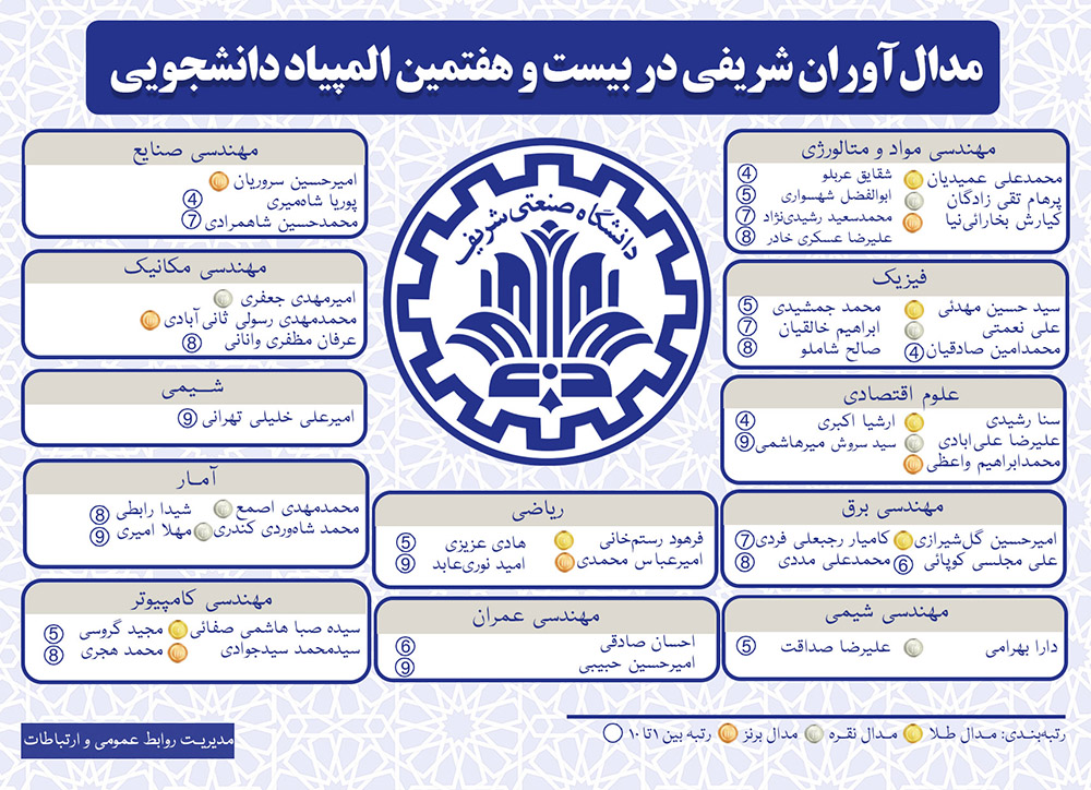 6 مدال طلا، 7مدال نقره و 6 مدال برنز، حاصل تلاش دانشجویان دانشگاه صنعتی شریف در بیست و هفتمین المپیاد علمی کشور